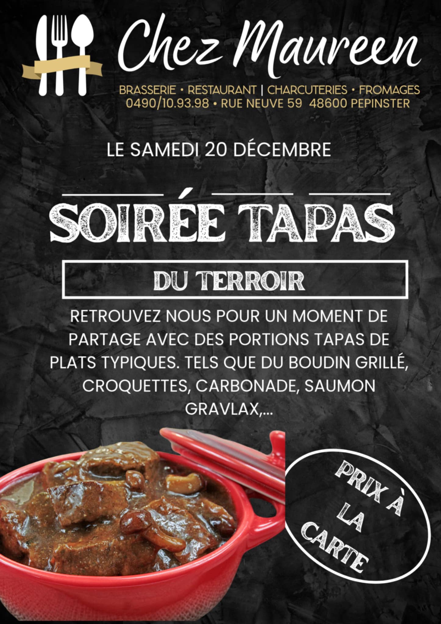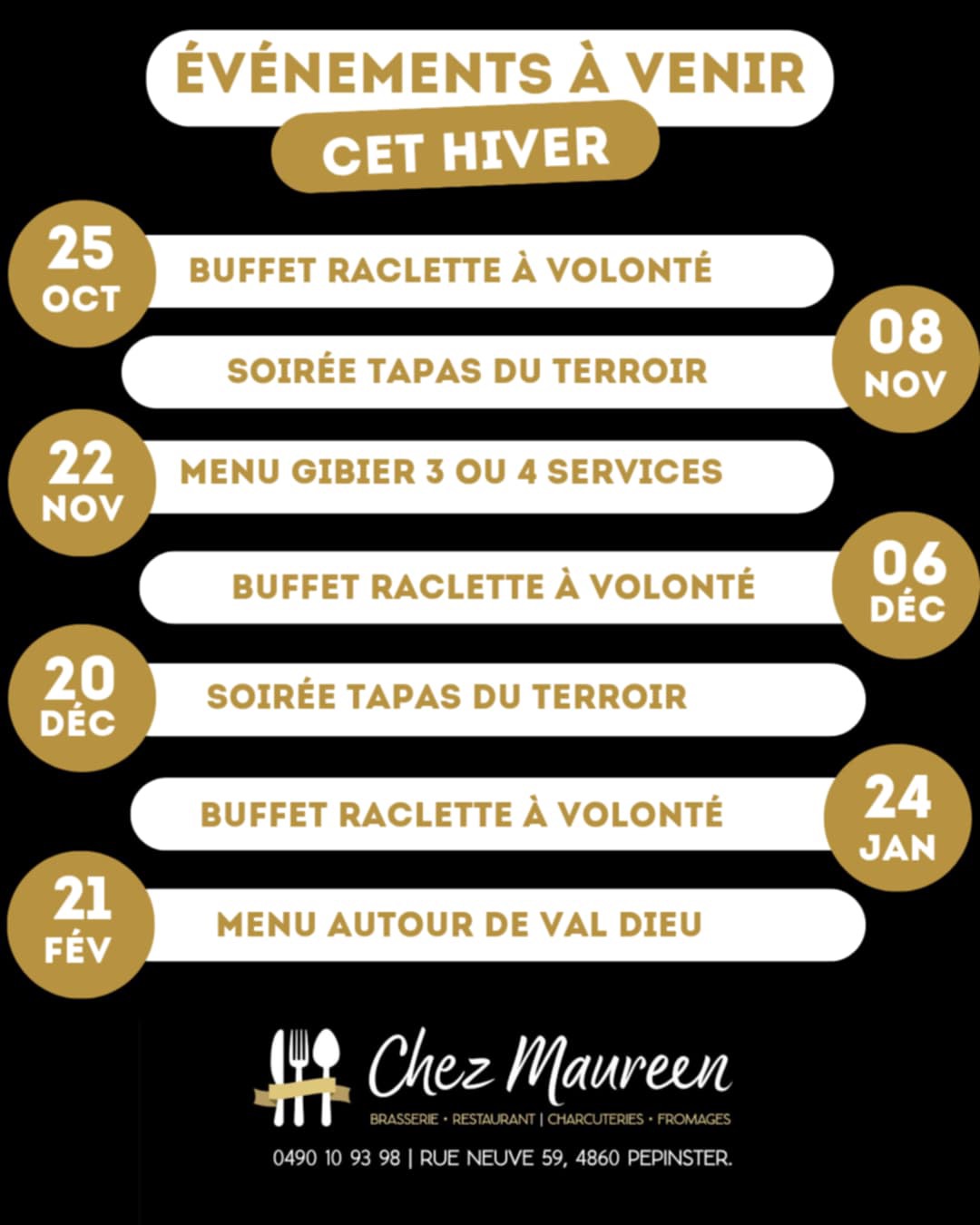 Vous pouvez retrouver « Chez Maureen » un comptoir avec des charcuteries et des fromages de nos régions et autre ainsi qu’un restaurant pouvant accueillir jusqu’à 46 couverts en intérieur et 34 couverts en terrasse.